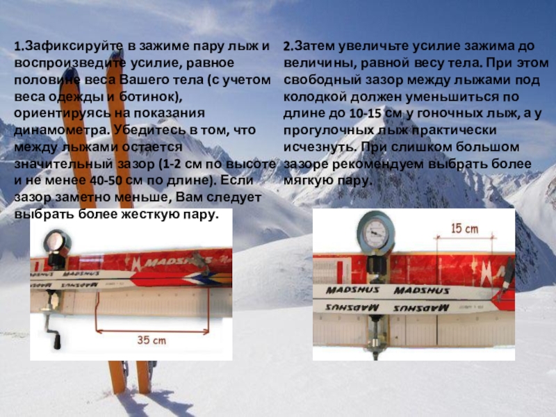 2.Затем увеличьте усилие зажима до величины, равной весу тела. При этом свободный зазор между лыжами под колодкой должен уменьшиться по длине до 10-15 см у гоночных лыж, а у прогулочных лыж практически исчезнуть. При слишком большом зазоре рекомендуем выбрать более мягкую пару.