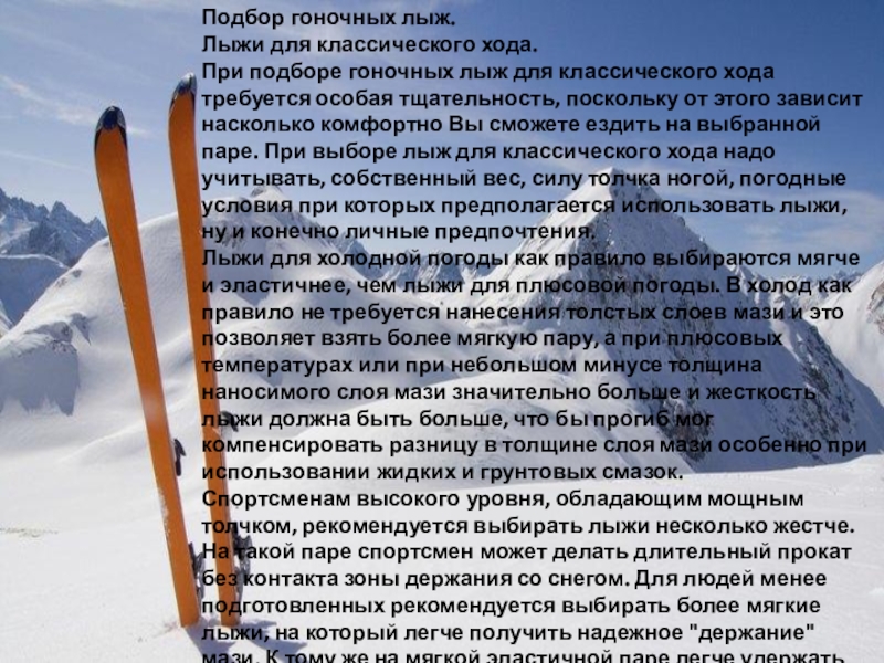 Если лыжи отвечают всем перечисленным выше требованиям, то они подходят Вам по жесткости. В зависимости от индивидуальных особенностей Вашей техники классического хода, лыжи могут быть чуть менее жесткими, чем это требуется в соответствии с рекомендациями, особенно если Вы не обладаете резким толчком или Вы не стремитесь к достижению наивысшего результата в лыжных гонках, но предпочитаете комфортное катание с надежным «держанием» лыж.