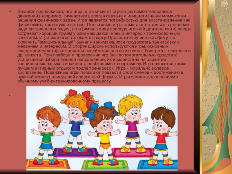 Лесгафт подчёркивал, что игра, в отличие от строго регламентированных движений (например,