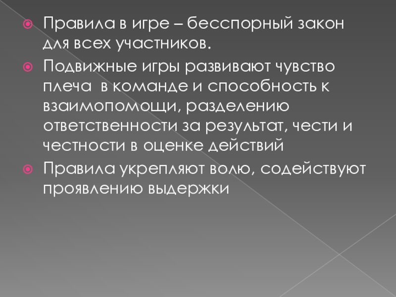Правила в игре – бесспорный закон для всех участников.Подвижные игры развивают чувство плеча в команде и способность