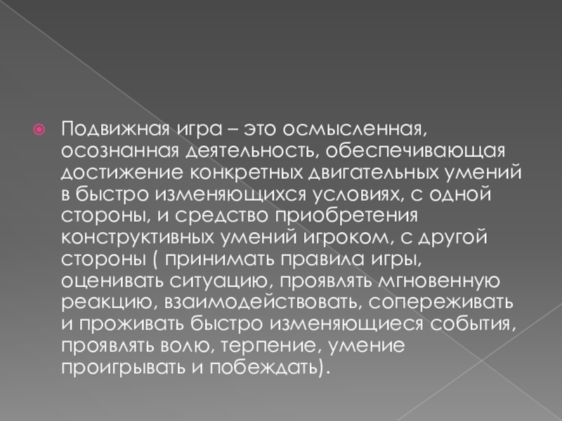 Подвижная игра – это осмысленная, осознанная деятельность, обеспечивающая достижение конкретных двигательных умений в быстро изменяющихся условиях, с одной стороны, и средство приобретения конструктивных умений игроком, с другой стороны ( принимать правила игры, оценивать ситуацию, проявлять мгновенную