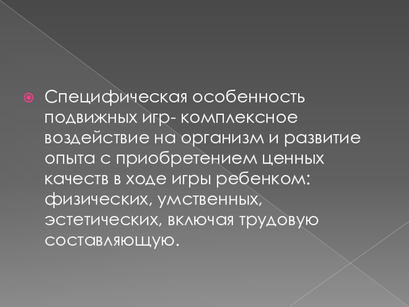 Специфическая особенность подвижных игр- комплексное воздействие на организм и развитие опыта с приобретением ценных качеств в ходе