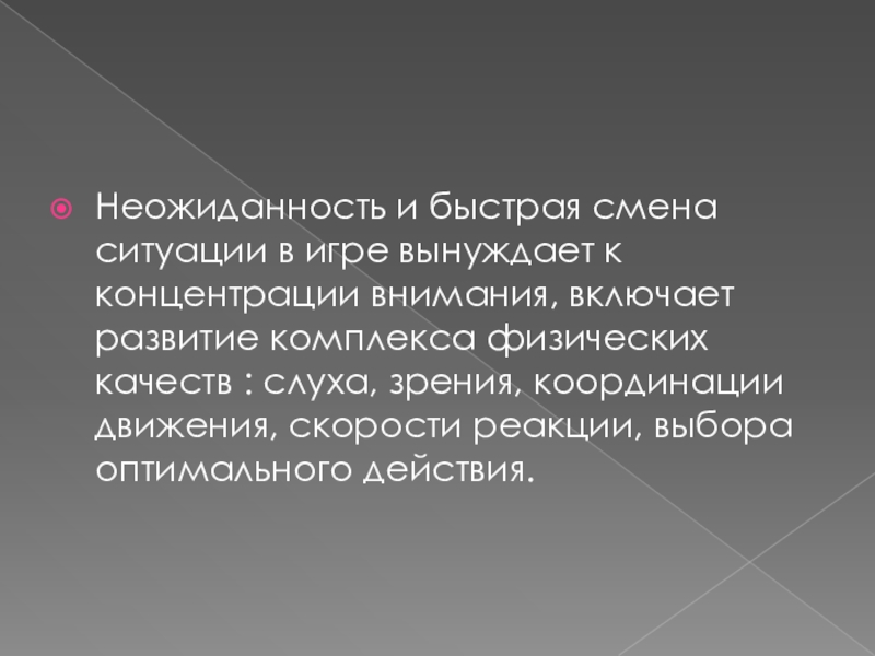 Слайд 4Неожиданность и быстрая смена ситуации в игре вынуждает к концентрации внимания,