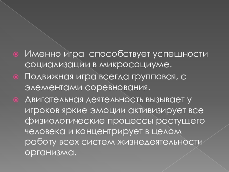 Именно игра способствует успешности социализации в микросоциуме.Подвижная игра всегда групповая, с элементами соревнования.Двигательная деятельность вызывает у игроков