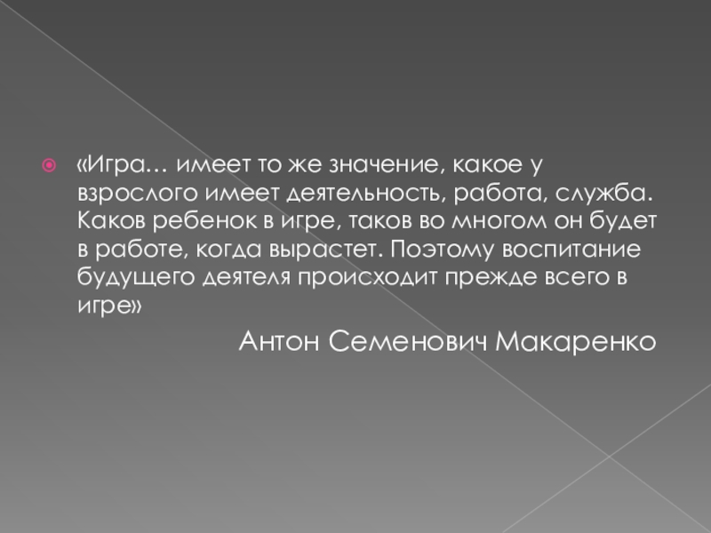 Слайд 9«Игра… имеет то же значение, какое у взрослого имеет деятельность, работа,