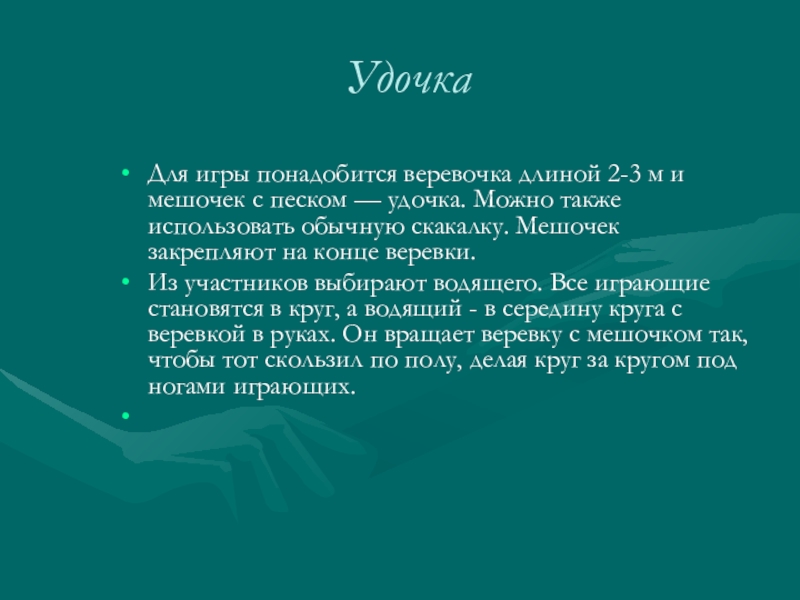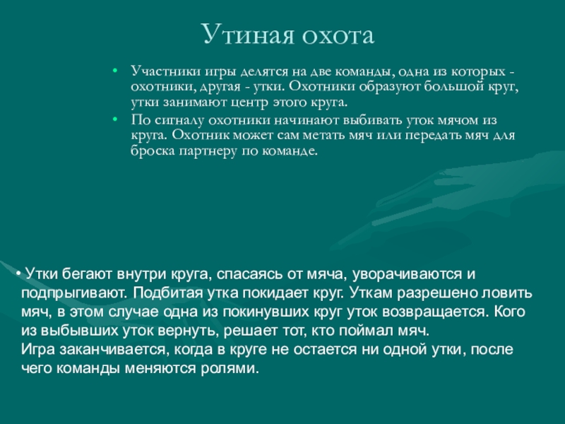 Утки бегают внутри круга, спасаясь от мяча, уворачиваются и подпрыгивают. Подбитая утка покидает круг. Уткам разрешено ловить мяч, в этом случае одна из покинувших круг уток возвращается. Кого из выбывших уток вернуть, решает тот, кто поймал мяч.