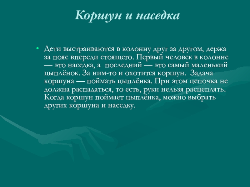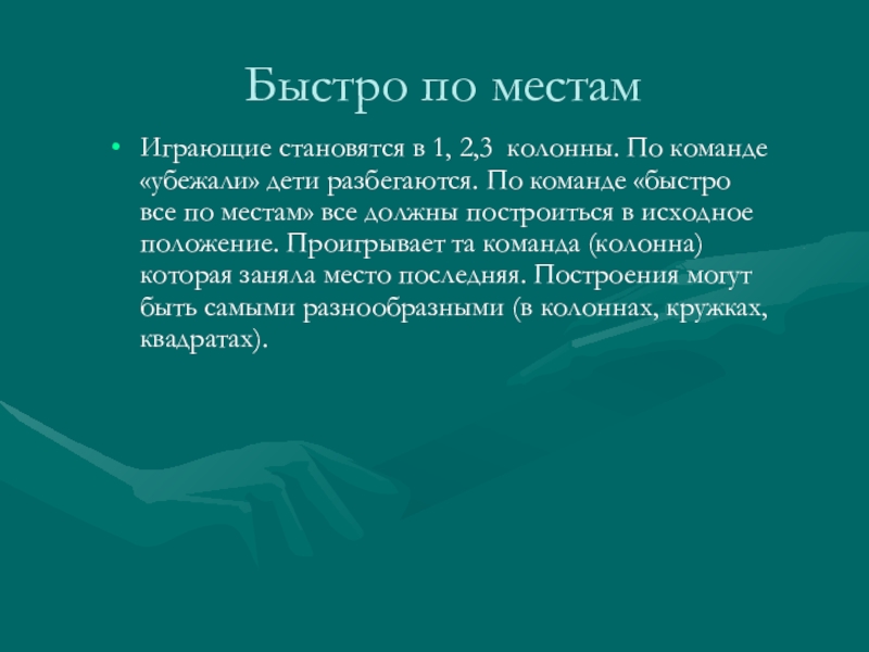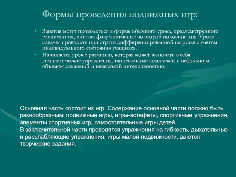 В заключительной части проводятся упражнения на гибкость, дыхательные и расслабляющие упражнения, игры малой подвижности, даются творческие задания.