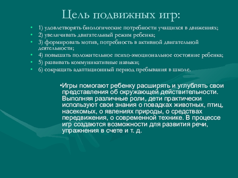 Игры помогают ребенку расширять и углублять свои представления об окружающей действительности. Выполняя различные роли, дети практически используют свои знания о повадках животных, птиц, насекомых, о явлениях природы, о средствах передвижения, о современной технике. В процессе игр создаются возможности для развития речи, упражнения в счете и т. д.