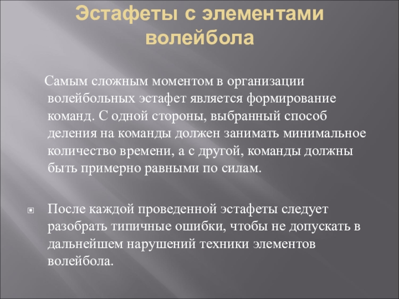 После каждой проведенной эстафеты следует разобрать типичные ошибки, чтобы не допускать в дальнейшем нарушений техники элементов волейбола.
