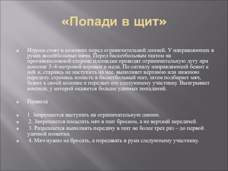 в руках волейбольные мячи. Перед баскетбольным щитом на противоположной стороне площадки проводят ограничительную дугу при помощи 3–4-метровой веревки и мела. По сигналу направляющий бежит к ней и, стараясь не наступить на нее, выполняет верхнюю или нижнюю передачу, стремясь попасть в баскетбольный щит, затем подбирает мяч, бежит к своей колонне и передает его следующему участнику. Выигрывает команда, у которой окажется больше удачных попаданий.