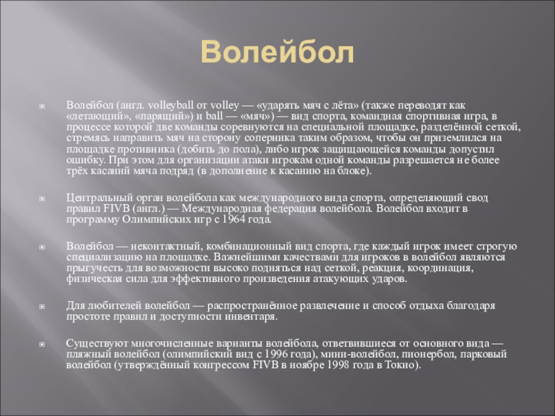 Волейбол (англ. volleyball от volley — «ударять мяч с лёта» (также