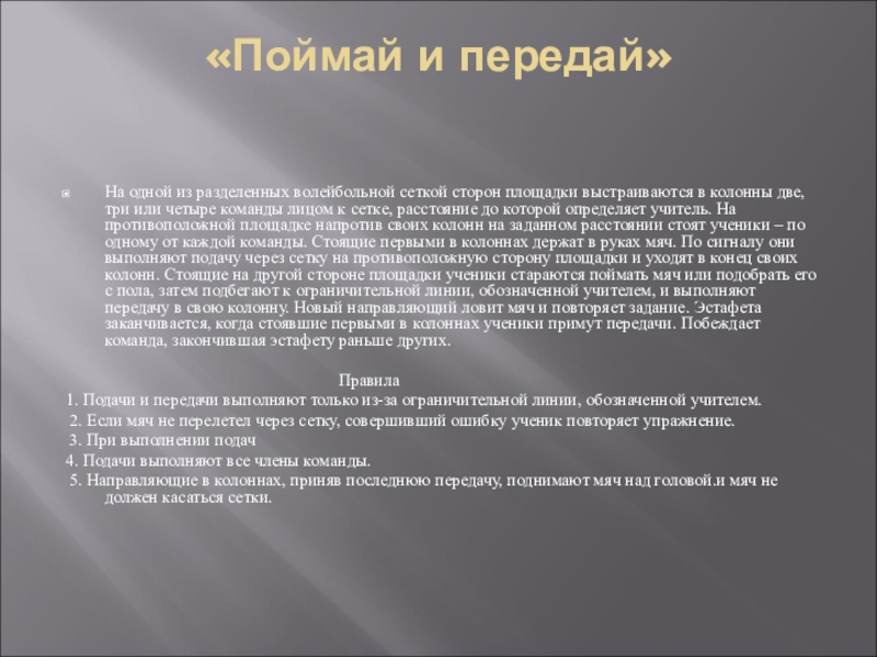 друг от друга. К ним лицом на расстоянии, установленном учителем, встают капитаны с мячом в руках. Перед колоннами и капитанами проводятся ограничительные линии. По сигналу капитаны посылают свои мячи любой волейбольной передачей первым игрокам в колоннах. Те выполняют встречную передачу и уходят в конец колонн. Эстафета заканчивается, когда все участники выполнят передачу своим капитанам. Выигрывает команда, раньше выполнившая задание.