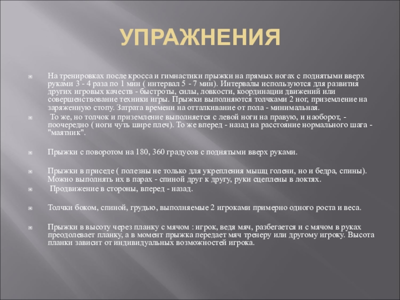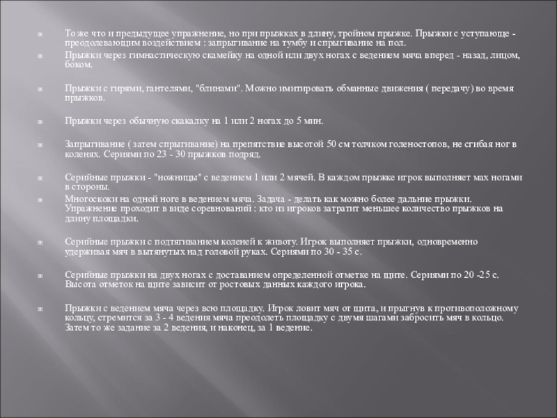 поднятыми вверх руками 3 - 4 раза по 1 мин ( интервал 5 - 7 мин). Интервалы используются для развития других игровых качеств - быстроты, силы, ловкости, координации движений или совершенствование техники игры. Прыжки выполняются толчками 2 ног, приземление на заряженную стопу. Затрата времени на отталкивание от пола - минимальная.