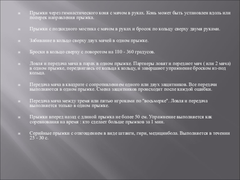 Слайд 16Прыжки через гимнастического коня с мячом в руках. Конь может быть