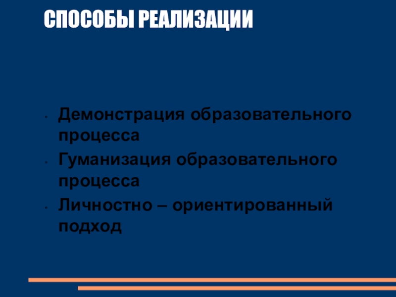 СПОСОБЫ РЕАЛИЗАЦИИДемонстрация образовательного процессаГуманизация образовательного процессаЛичностно – ориентированный подход