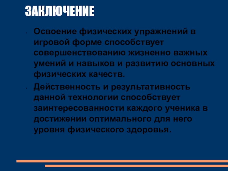 ЗАКЛЮЧЕНИЕОсвоение физических упражнений в игровой форме способствует совершенствованию жизненно важных умений и навыков и развитию основных физических