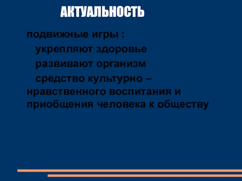 АКТУАЛЬНОСТЬподвижные игры : укрепляют здоровье развивают организм средство культурно – нравственного воспитания и приобщения человека к обществу