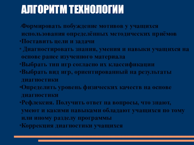 АЛГОРИТМ ТЕХНОЛОГИИФормировать побуждение мотивов у учащихся использования определённых методических приёмовПоставить цели и задачи Диагностировать знания, умения и