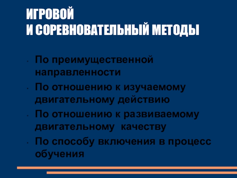 ИГРОВОЙ  И СОРЕВНОВАТЕЛЬНЫЙ МЕТОДЫПо преимущественной направленности По отношению к изучаемому двигательному действию По отношению к развиваемому