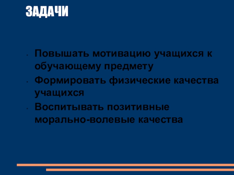 ЗАДАЧИПовышать мотивацию учащихся к обучающему предметуФормировать физические качества учащихсяВоспитывать позитивные морально-волевые качества