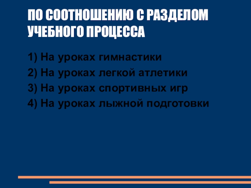 ПО СООТНОШЕНИЮ С РАЗДЕЛОМ УЧЕБНОГО ПРОЦЕССА1) На уроках гимнастики 2) На уроках легкой атлетики3) На уроках спортивных
