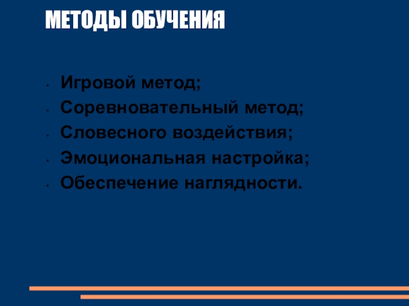 МЕТОДЫ ОБУЧЕНИЯИгровой метод;Соревновательный метод;Словесного воздействия;Эмоциональная настройка;Обеспечение наглядности.