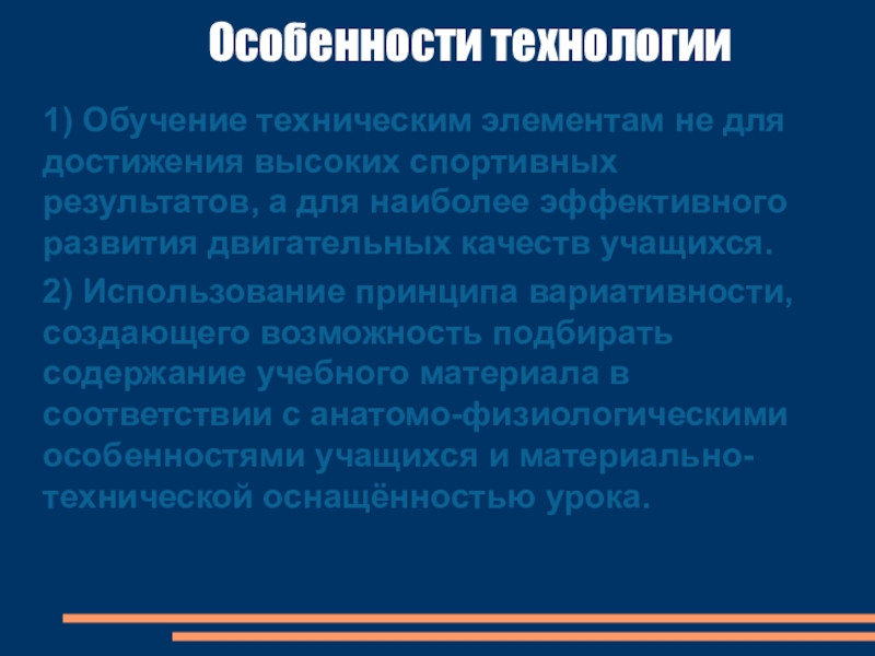 Особенности технологии1) Обучение техническим элементам не для достижения высоких спортивных результатов, а для наиболее эффективного развития двигательных
