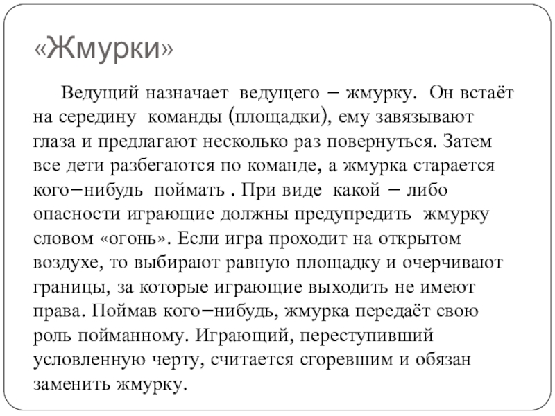 (площадки), ему завязывают глаза и предлагают несколько раз повернуться. Затем все дети разбегаются по команде, а жмурка старается кого–нибудь поймать . При виде какой – либо опасности играющие должны предупредить жмурку словом «огонь». Если игра проходит на открытом воздухе, то выбирают равную площадку и очерчивают границы, за которые играющие выходить не имеют права. Поймав кого–нибудь, жмурка передаёт свою роль пойманному. Играющий, переступивший условленную черту, считается сгоревшим и обязан заменить жмурку.