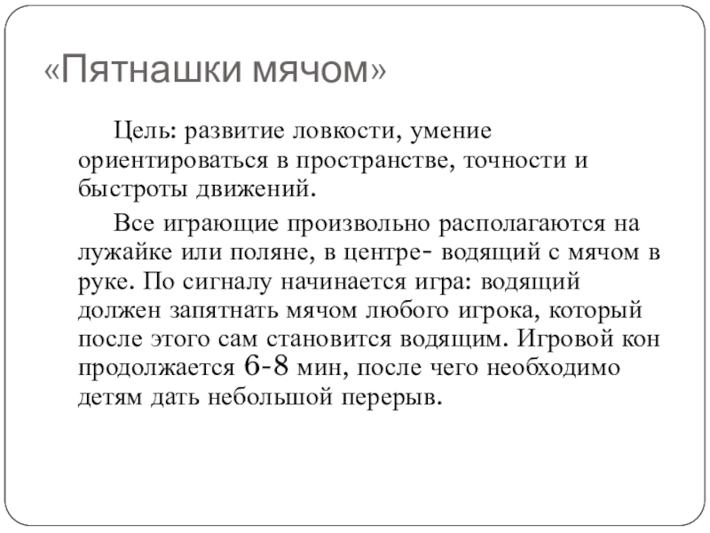 «Пятнашки мячом»Цель: развитие ловкости, умение ориентироваться в пространстве, точности и быстроты движений.Все играющие произвольно располагаются на лужайке