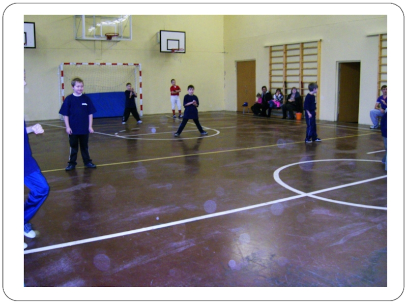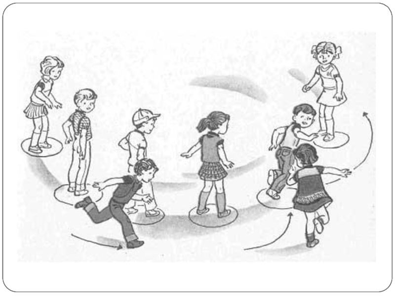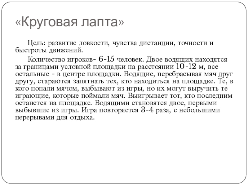 «Круговая лапта»Цель: развитие ловкости, чувства дистанции, точности и быстроты движений.Количество игроков- 6-15 человек. Двое водящих находятся за