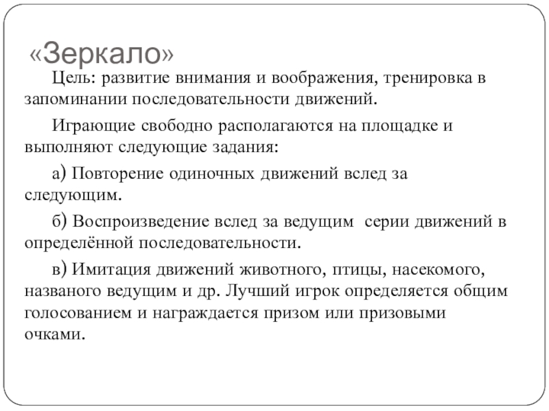 «Зеркало»Цель: развитие внимания и воображения, тренировка в запоминании последовательности движений.Играющие свободно располагаются на площадке и выполняют следующие