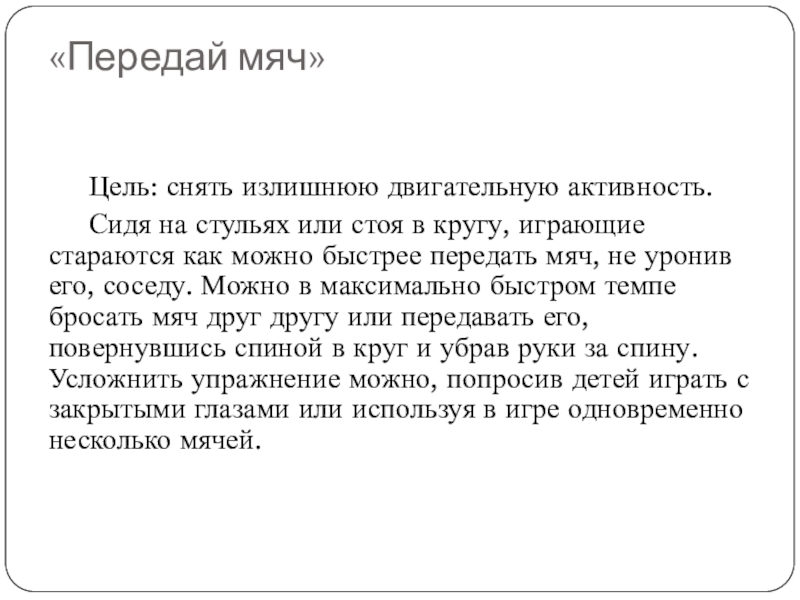 «Передай мяч» Цель: снять излишнюю двигательную активность.Сидя на стульях или стоя в кругу, играющие стараются как можно быстрее передать мяч, не уронив его, соседу. Можно в максимально быстром темпе бросать мяч друг другу или передавать его,