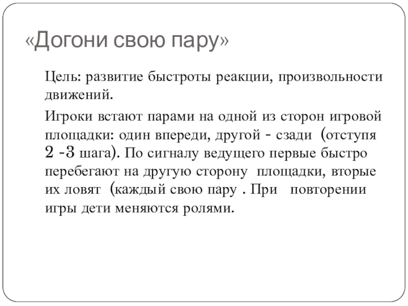 «Догони свою пару»Цель: развитие быстроты реакции, произвольности движений.Игроки встают парами на одной из сторон игровой площадки: один
