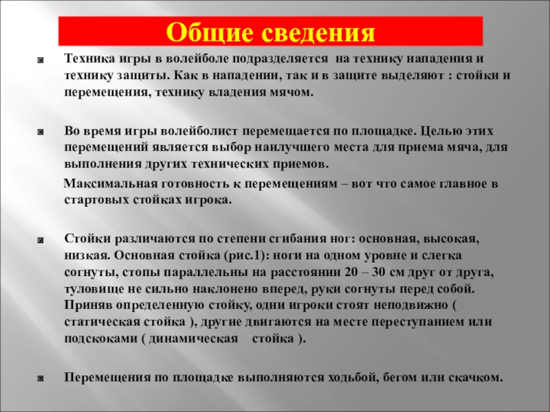 Стойки различаются по степени сгибания ног: основная, высокая, низкая. Основная стойка (рис.1): ноги на одном уровне и слегка согнуты, стопы параллельны на расстоянии 20 – 30 см друг от друга, туловище не сильно наклонено вперед, руки согнуты перед собой. Приняв определенную стойку, одни игроки стоят неподвижно ( статическая стойка ), другие двигаются на месте переступанием или подскоками ( динамическая стойка ).