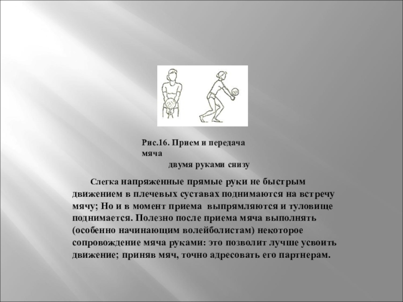 Слегка напряженные прямые руки не быстрым движением в плечевых суставах поднимаются на встречу мячу; Но и в момент приема выпрямляются и туловище поднимается. Полезно после приема мяча выполнять (особенно начинающим волейболистам) некоторое сопровождение мяча руками: это позволит лучше усвоить движение; приняв мяч, точно адресовать его партнерам.