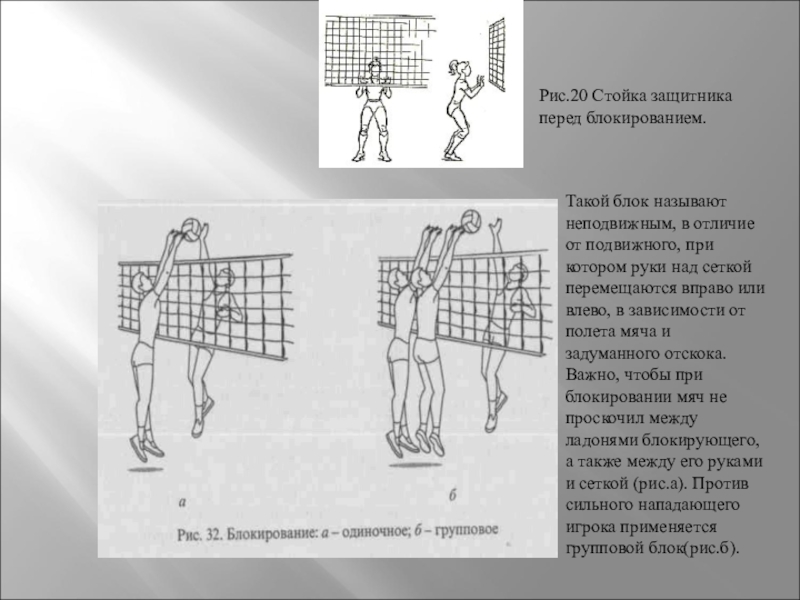 подвижного, при котором руки над сеткой перемещаются вправо или влево, в зависимости от полета мяча и задуманного отскока. Важно, чтобы при блокировании мяч не проскочил между ладонями блокирующего, а также между его руками и сеткой (рис.а). Против сильного нападающего игрока применяется групповой блок(рис.б).
