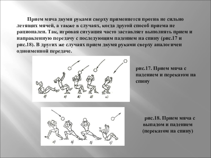 а также в случаях, когда другой способ приема не рационален. Так, игровая ситуация часто заставляет выполнять прием и направленную передачу с последующим падением на спину (рис.17 и рис.18). В других же случаях прием двумя руками сверху аналогичен одноименной передаче.