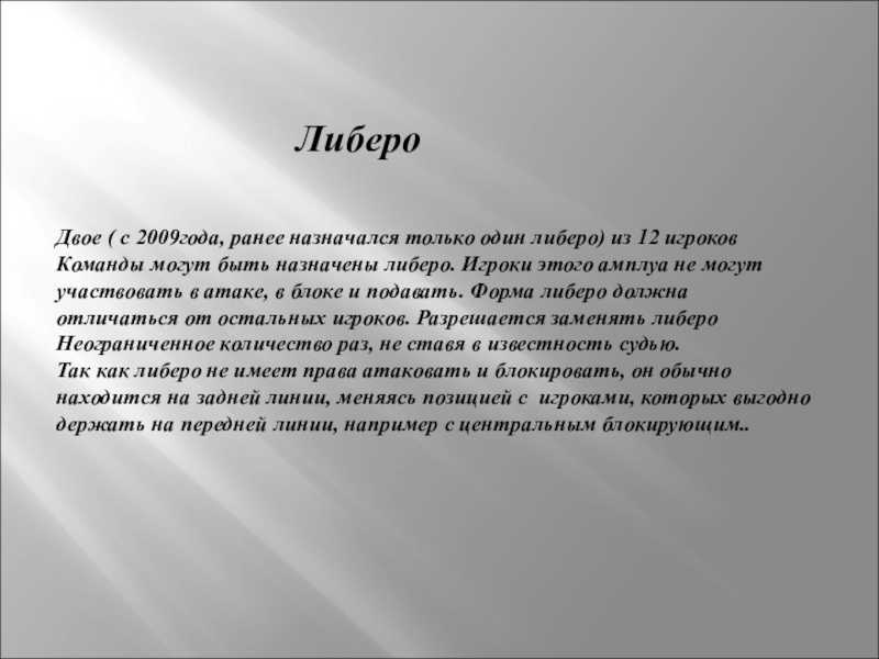 Так как либеро не имеет права атаковать и блокировать, он обычно