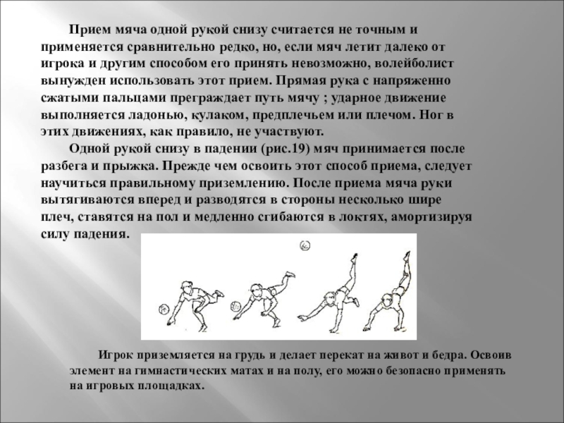 Одной рукой снизу в падении (рис.19) мяч принимается после разбега и прыжка. Прежде чем освоить этот способ приема, следует научиться правильному приземлению. После приема мяча руки вытягиваются вперед и разводятся в стороны несколько шире плеч, ставятся на пол и медленно сгибаются в локтях, амортизируя силу падения.