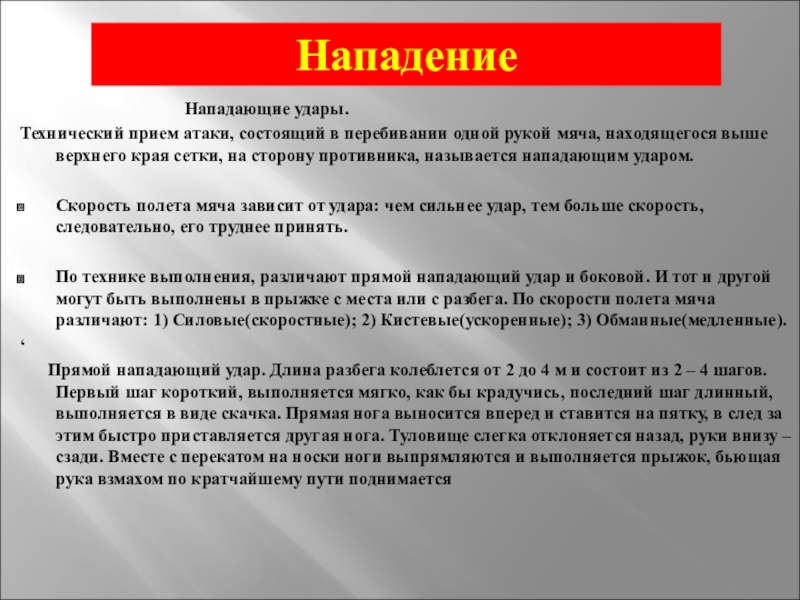 Бег . Быстрые перемещения по площадке и резкие изменения направлений выполняются бегом на слегка согнутых ногах. Последний беговой шаг наиболее длинный, так как после него следует стопорящее движение ( остановка, смена направления, выпрыгивание для нападающего удара или блока ).