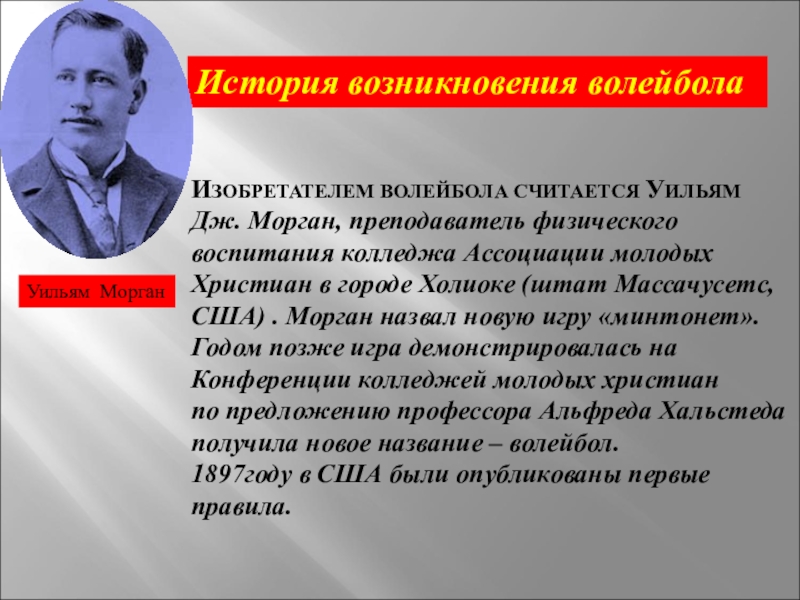 Слайд 4ИЗОБРЕТАТЕЛЕМ ВОЛЕЙБОЛА СЧИТАЕТСЯ УИЛЬЯМ