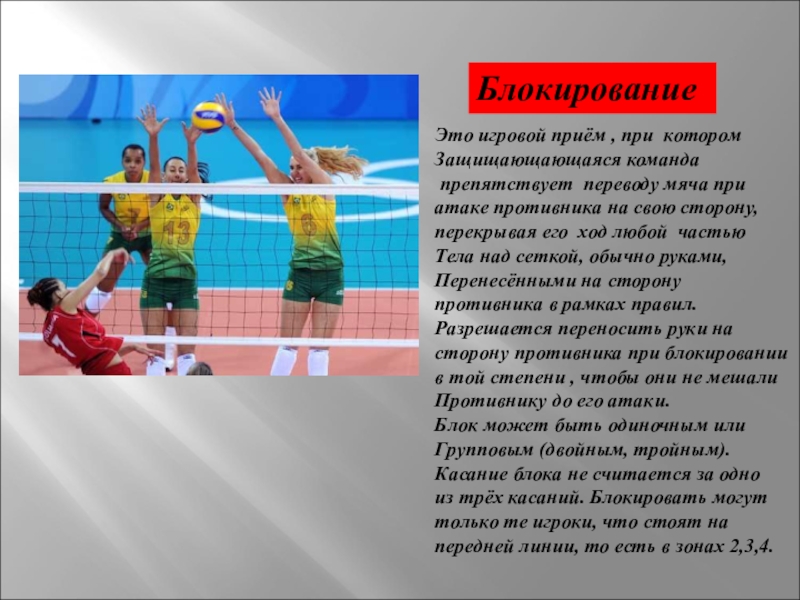 защиты, с помощь которого преграждают путь мячу после нападающего удара со стороны противника, называется блоком, а действие защитников – блокированием.
