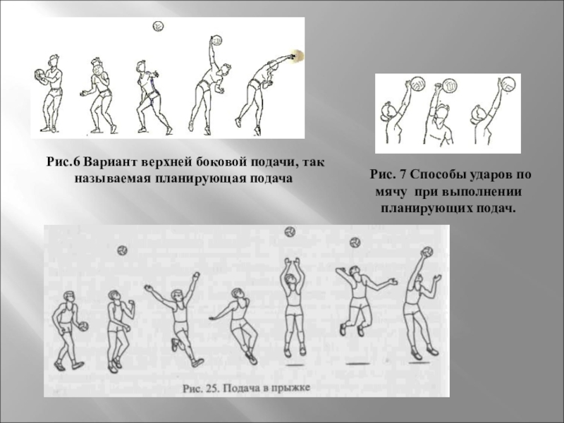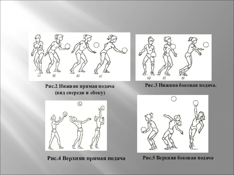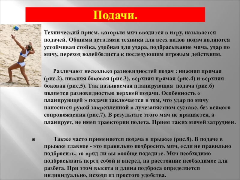 техники для всех видов подач являются устойчивая стойка, удобная для удара, подбрасывание мяча, удар по мячу, переход волейболиста к последующим игровым действиям.