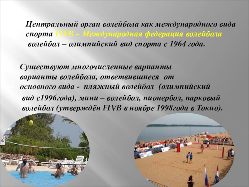 волейбол (утверждён FIVB в ноябре 1998года в Токио).