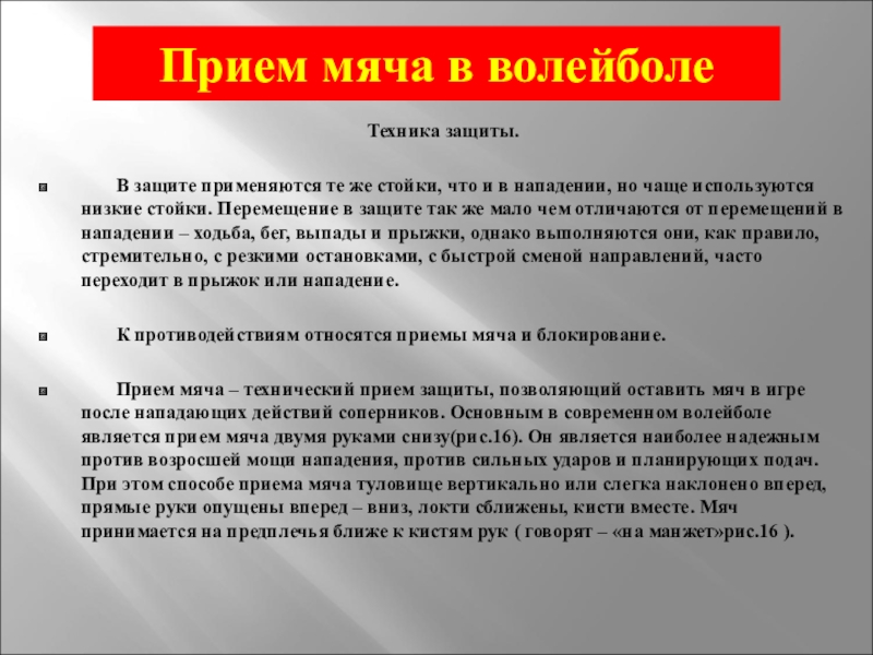 Прием мяча – технический прием защиты, позволяющий оставить мяч в игре после нападающих действий соперников. Основным в современном волейболе является прием мяча двумя руками снизу(рис.16). Он является наиболее надежным против возросшей мощи нападения, против сильных ударов и планирующих подач. При этом способе приема мяча туловище вертикально или слегка наклонено вперед, прямые руки опущены вперед – вниз, локти сближены, кисти вместе. Мяч принимается на предплечья ближе к кистям рук ( говорят – «на манжет»рис.16 ).