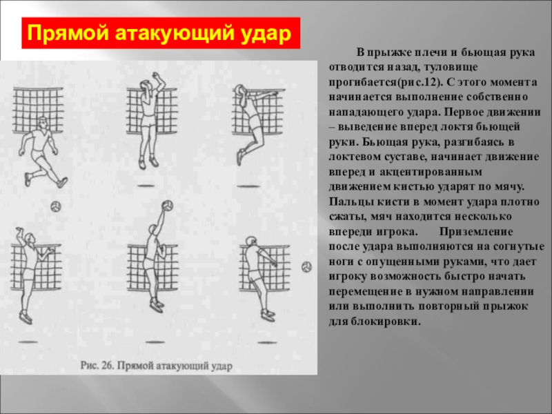 Затем следует выпрыгивание. Движение начинают ноги, затем продолжают руки. При приближении мяча руки выпрямляются и ставятся на пути его движения: пальцы рук разведены и оптимально напряжены, кисти слегка согнуты, чтоб мяч направить вперед – вниз на площадку противника.