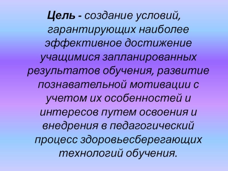 Цель - создание условий, гарантирующих наиболее эффективное достижение учащимися запланированных результатов обучения, развитие познавательной мотивации с учетом