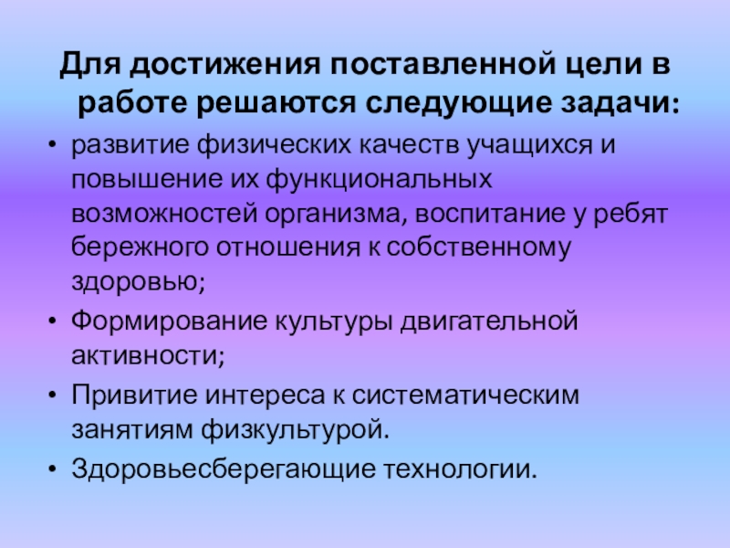 Для достижения поставленной цели в работе решаются следующие задачи:развитие физических качеств учащихся и повышение их функциональных возможностей