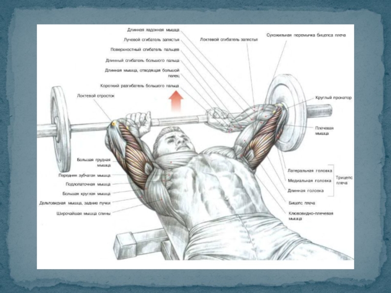 Слайд 21. Жим штанги лежа средним хватом 4 х 12,8,6,4. (1 х 12;