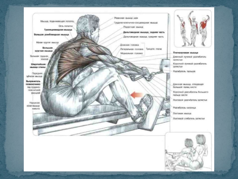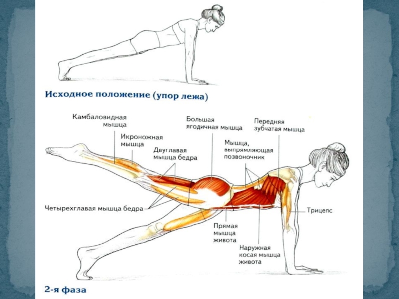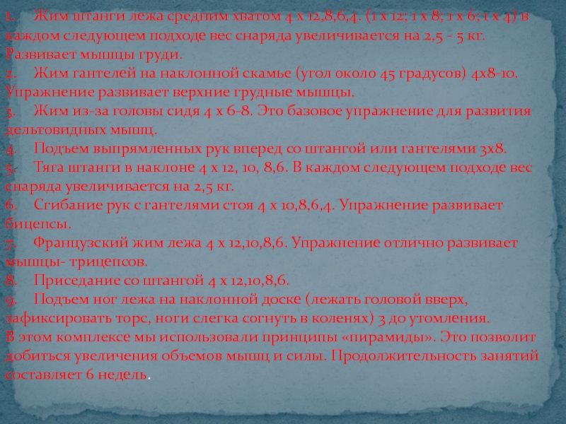 1 х 8; 1 х 6; 1 х 4) в каждом следующем подходе вес снаряда увеличивается на 2,5 - 5 кг. Развивает мышцы груди. 2. Жим гантелей на наклонной скамье (угол около 45 градусов) 4x8-10. Упражнение развивает верхние грудные мышцы. 3. Жим из-за головы сидя 4 х 6-8. Это базовое упражнение для развития дельтовидных мышц. 4. Подъем выпрямленных рук вперед со штангой или гантелями 3x8. 5. Тяга штанги в наклоне 4 х 12, 10, 8,6. В каждом следующем подходе вес снаряда увеличивается на 2,5 кг. 6. Сгибание рук с гантелями стоя 4 х 10,8,6,4. Упражнение развивает бицепсы. 7. Французский жим лежа 4 х 12,10,8,6. Упражнение отлично развивает мышцы- трицепсов. 8. Приседание со штангой 4 х 12,10,8,6. 9. Подъем ног лежа на наклонной доске (лежать головой вверх, зафиксировать торс, ноги слегка согнуть в коленях) 3 до утомления. В этом комплексе мы использовали принципы «пирамиды». Это позволит добиться увеличения объемов мышц и силы. Продолжительность занятий составляет 6 недель.